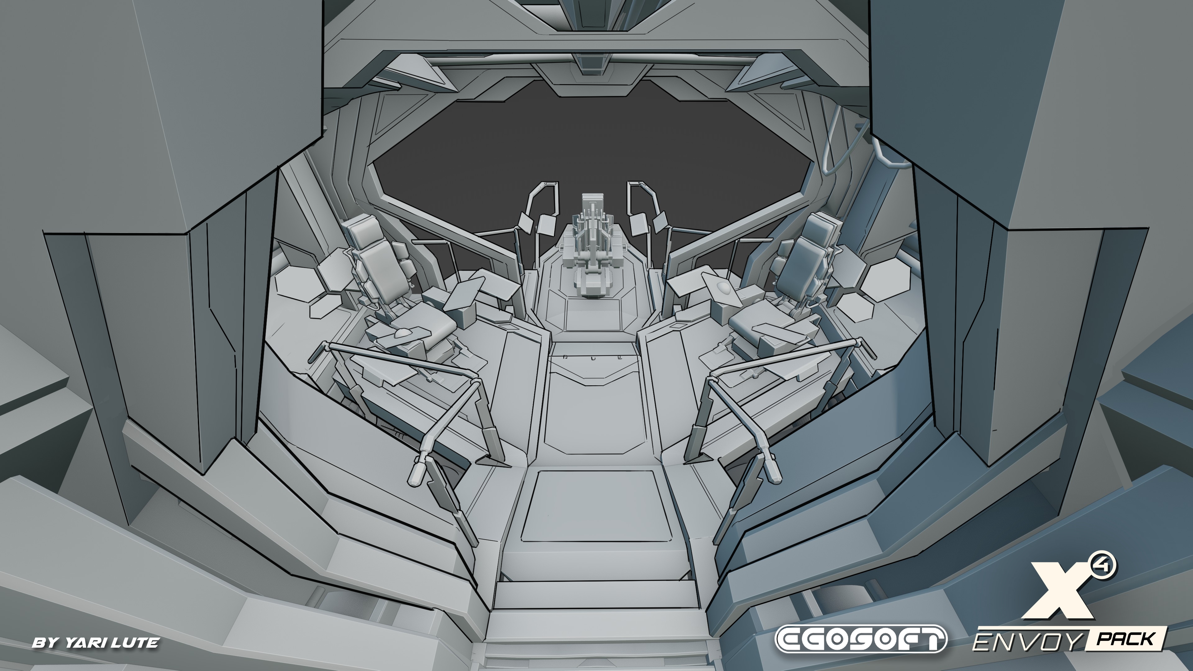 From the first silhouettes to the final render, the Envoy evolved through countless iterations - balancing stealth and strength, utility and comfort. Many of the shapes and proportions from Jerzy and Yari's early work remain clearly visible in the finished ship.